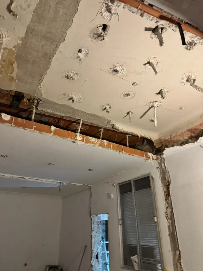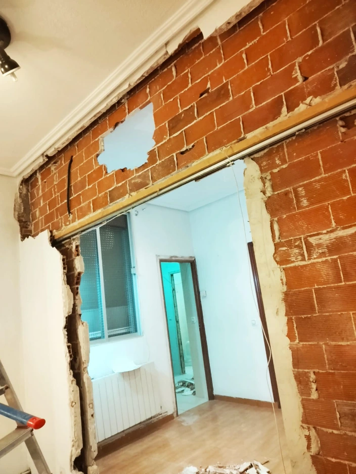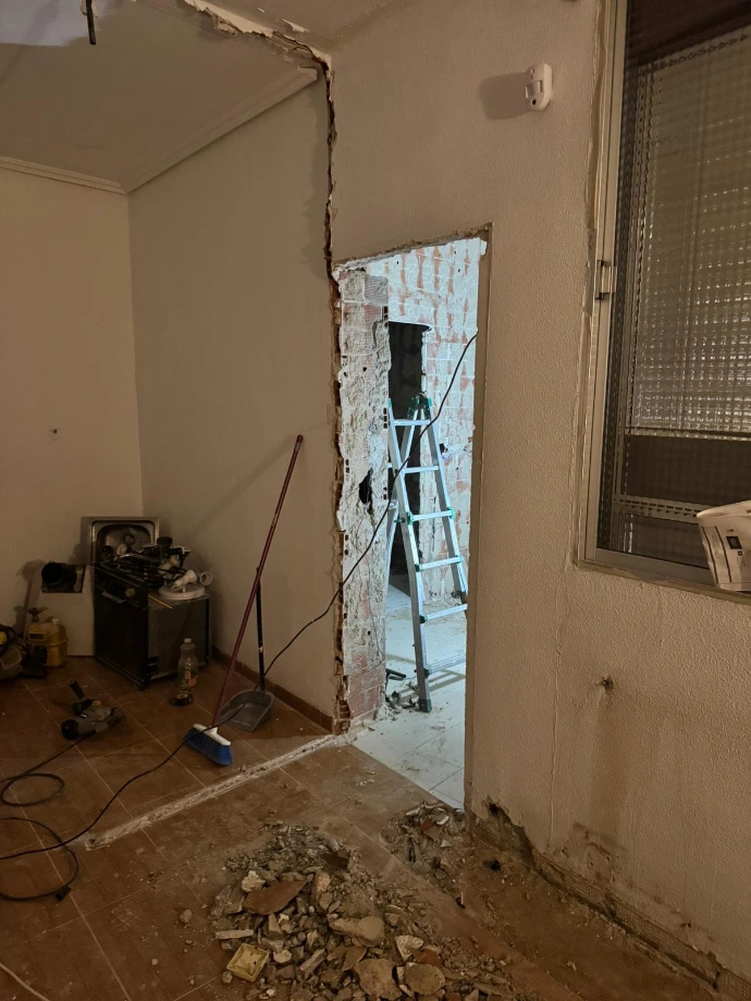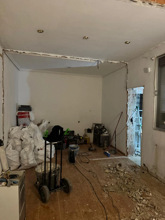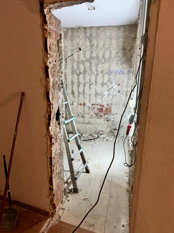 Se acuerda eliminar los muros que separan la habitación original. Se refuerza el equipo de reformistas para avanzar más rápido. Sergio el nuevo jefe de obra visita la obra y evalúa bajantes para considerar la posibilidad de sacar la cocina y separar cocina y baño