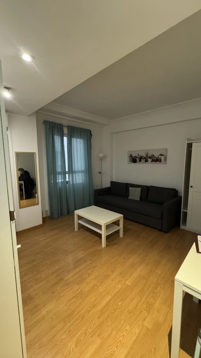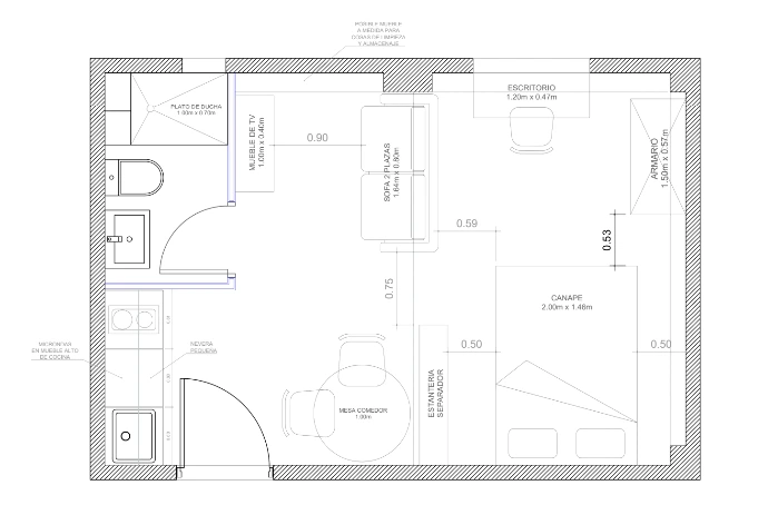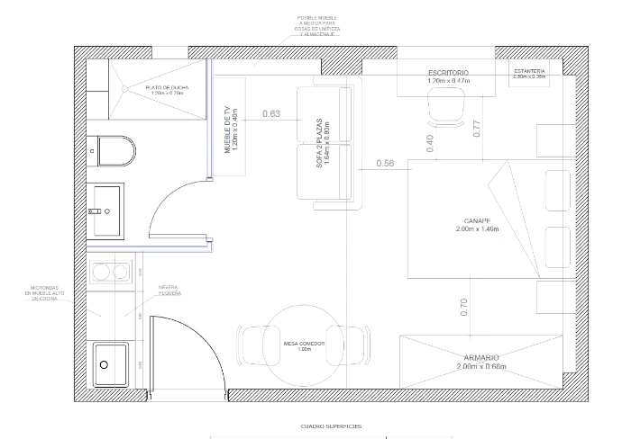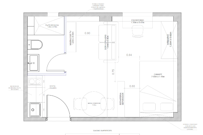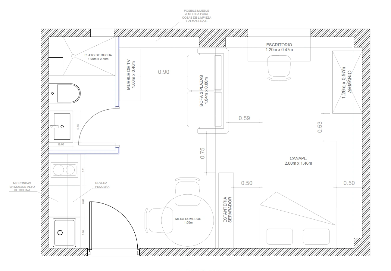 Se equilibra el espacio entre cocina y baño, se logra una cama con mayor privacidad y acceso por 3 costados, circulación libre en todo el piso, un escritorio iluminado, y tranquilo espacio de salón con sillón y tv